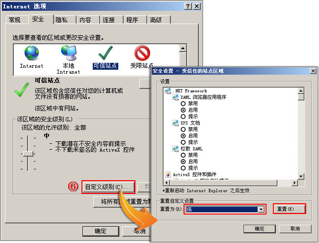 ⑥在“可信站點(diǎn)”的設(shè)置中,點(diǎn)擊“自定義級(jí)別”,在彈出的自定義窗口中,將“重置自定義設(shè)置”的安全級(jí)別調(diào)為“低”,點(diǎn)擊按鍵“重置”,然后點(diǎn)擊“確定”關(guān)閉自定義窗口。